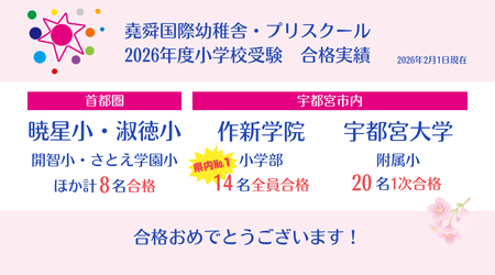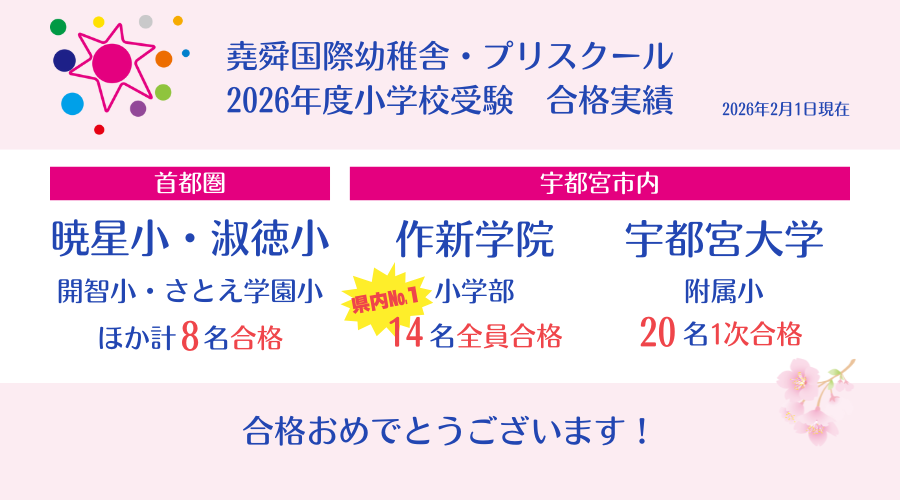 - 堯舜国際幼稚舎・プリスクールへの入園にご興味をお持ちいただき、誠にありがとうございます。堯舜は1985年の開園以来、教育熱心な保護者の皆様に支えられながら、地域における幼児英才教育・英語教育をけん引し、未来を担う多くの子どもたちを世に送り出してまいりました。【堯舜への入園の流れ】◆園見学/入園説明・相談 お電話(028-622-4248)、メール(gyoshun@academy.co.jp)等でお問い合わせの上、まずは園見学にお越しください。園児たちの学びの様子を通して、堯舜の教…